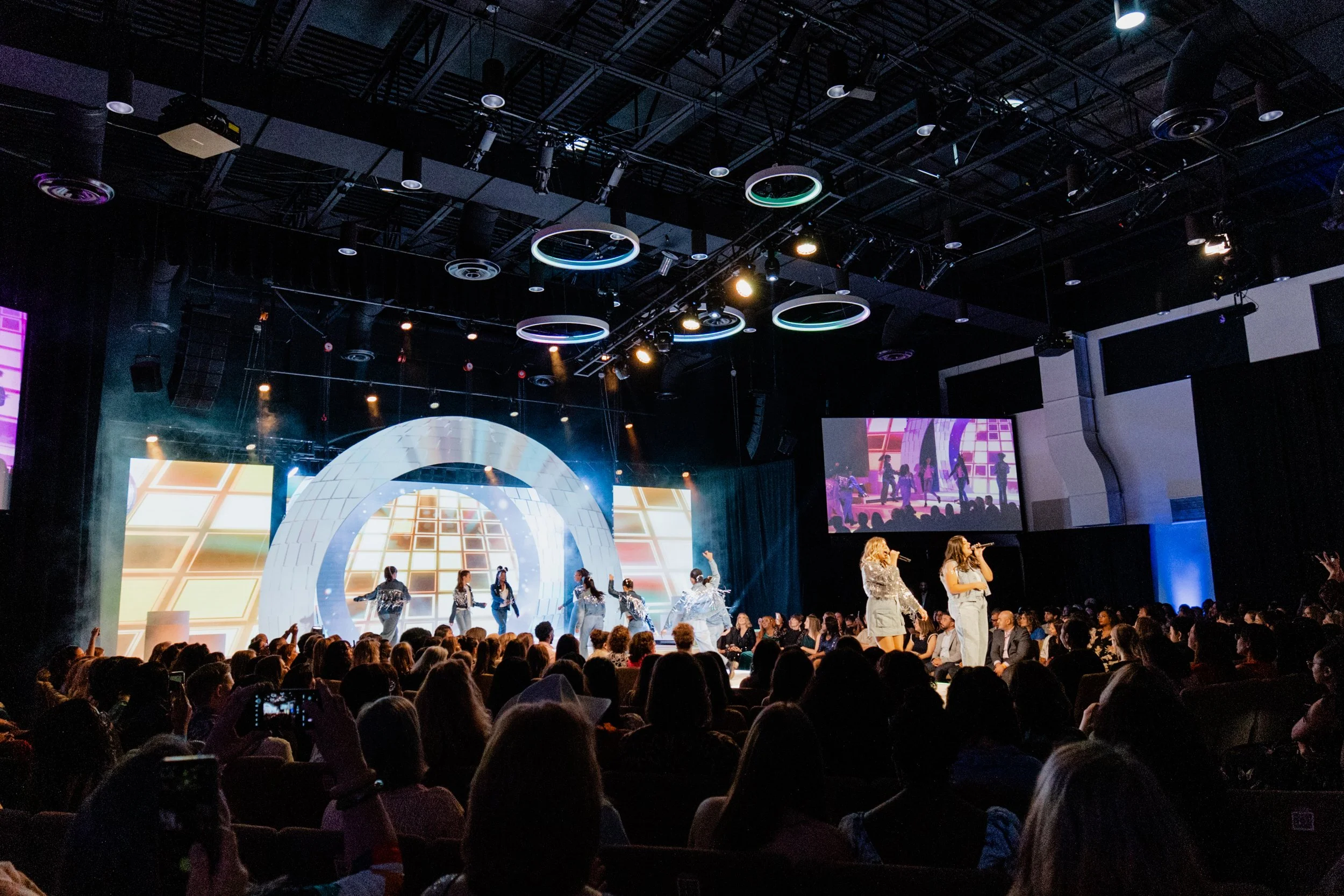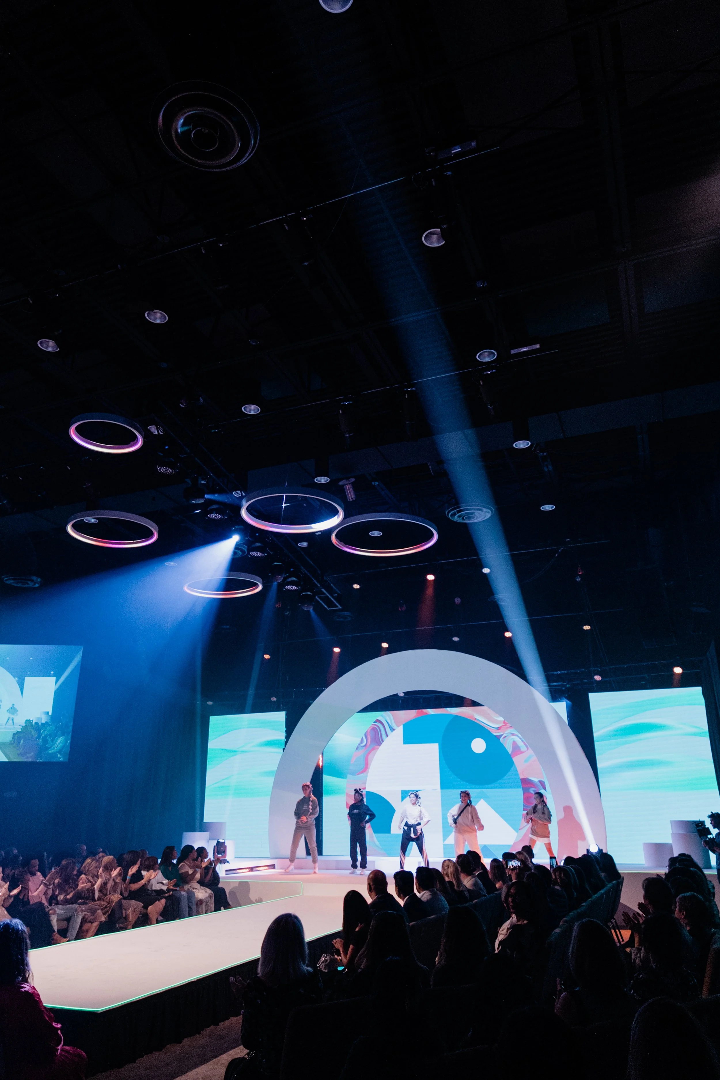 People on stage during a presentation or performance in a dark auditorium with colorful ring-shaped lights on the ceiling and large screens behind the stage.
